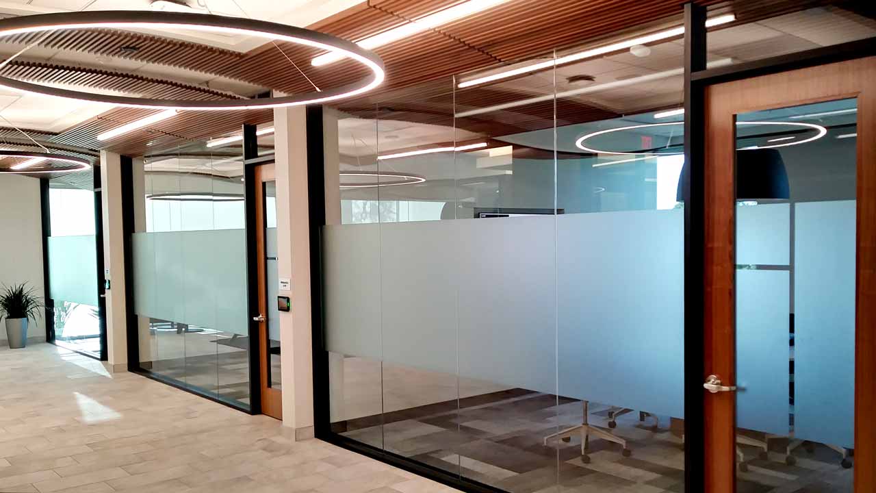 Decorative window film works great in a commercial business to increase privacy as well as create a design factor in any space such as a conference room or private office. You can choose from a variety of shades and opacities such as frosted window film or blackout film.
